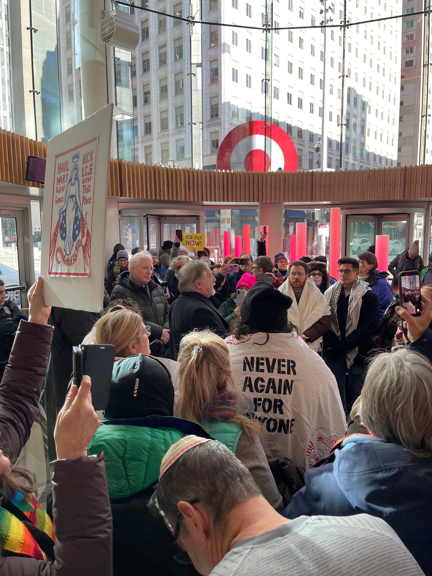 Sing- in at Target headquarters (based in Minneapolis). We did a surprise clergy action where we held the space by singing and also raised our demands to the corporation to stop cooperation with ICE. They tried to get us to leave, we resisted. We had calm de- escalators. We need to target not just government but all the businesses that cooperate with ICE. We need to force side- taking of corporations.