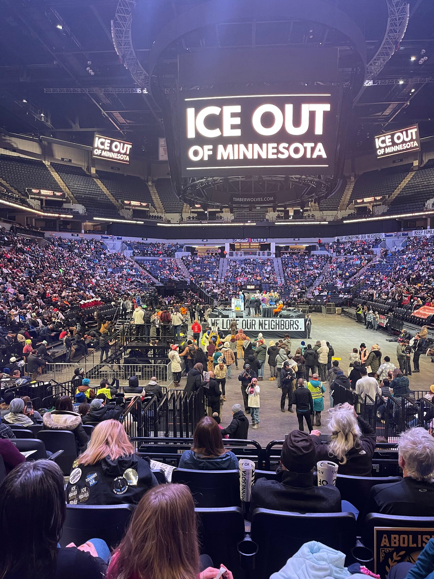 The end of the march culminated in a rally inside a massive stadium. On the jumbotron we saw “ICE OUT”. I can’t remember the last time I was in a stadium, but it felt so deeply OF THE PEOPLE of the place to gather in this space.